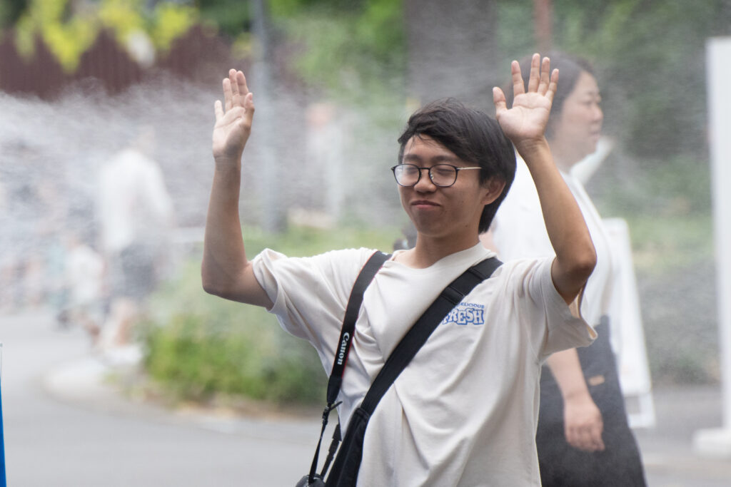 曇り空で涼しいとはいえど、歩いてくると汗ばんできますが、園内に設置されているミストクーラーで涼む一場面もありました。でもカメラだけは死守しないとですね!