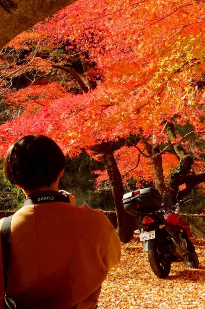 養老渓谷に到着!雲の切れ間から差し込んだ陽の光に照らされる、幻想的な紅葉を拝むことができました。